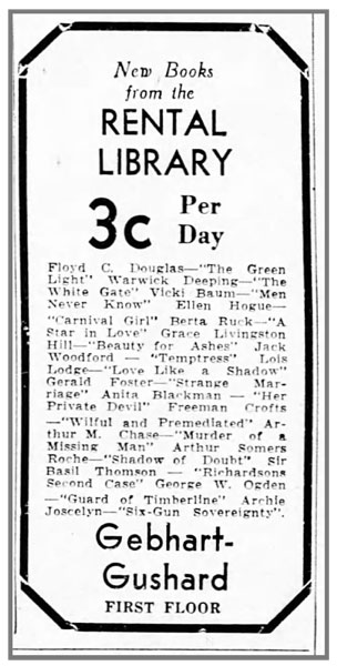 One interesting little piece that came up was a newspaper advertisement for a rental library. The general store operating out of the Gebhart Gushard building in Decatur, Illinois, appears to have had a rental library. You could rent books for just 3¢ a day, including this title, Love Like a Shadow.